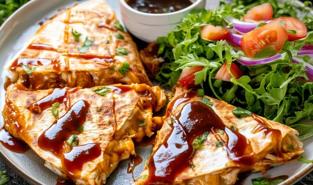 These quesadillas pair beautifully with fresh, light sides that balance the richness of the melted cheese and tangy barbecue sauce.