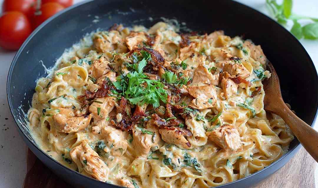 Creamy Italian-inspired pasta with tender chicken thighs, sun-dried tomatoes, and fresh spinach in a rich Parmesan sauce. Easy one-skillet dinner ready in 30 minutes.