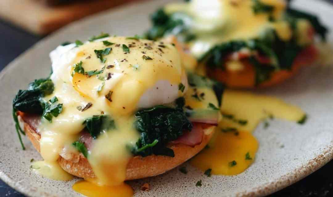 Step 6: Assemble Place a small mound of sauteed spinach on each English muffin half. Top with one poached egg, then spoon hollandaise sauce generously over the top.