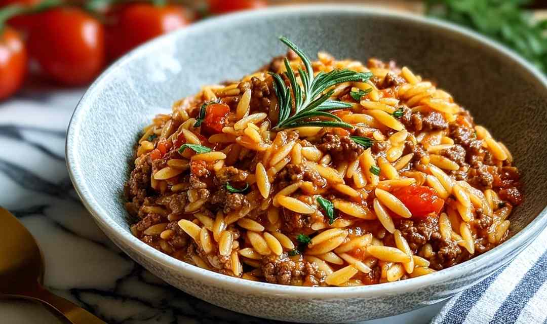 Quick one-pot Ground Beef Orzo with tender pasta, savory beef, and creamy Parmesan. Ready in 30 minutes!