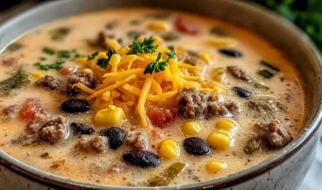 This Creamy Cowboy Soup is loaded with ground beef, bacon, beans, and corn in a rich, creamy cheddar broth. A hearty, satisfying one-pot dinner with 15 minutes of prep and 30 minutes of cook time.