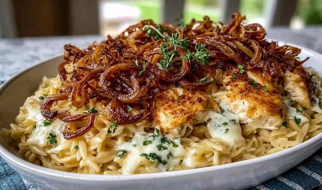 French Onion Chicken Orzo Casserole
