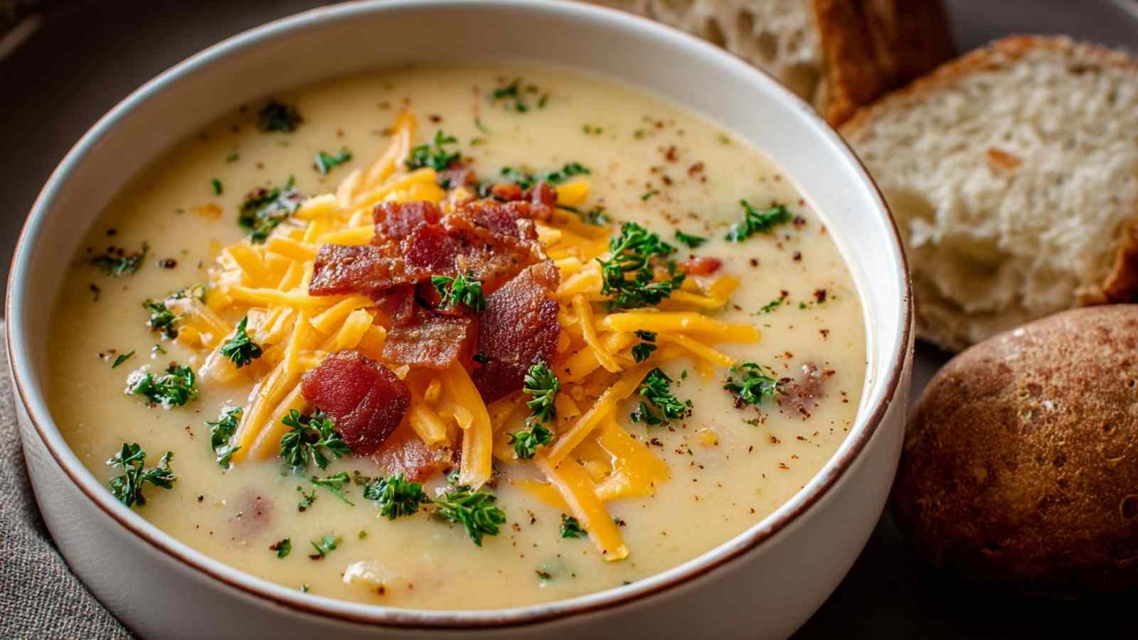 Crusty French bread: The crispy exterior and soft interior are perfect for dipping into the creamy soup, and the neutral flavor lets the bacon and cheese shine.