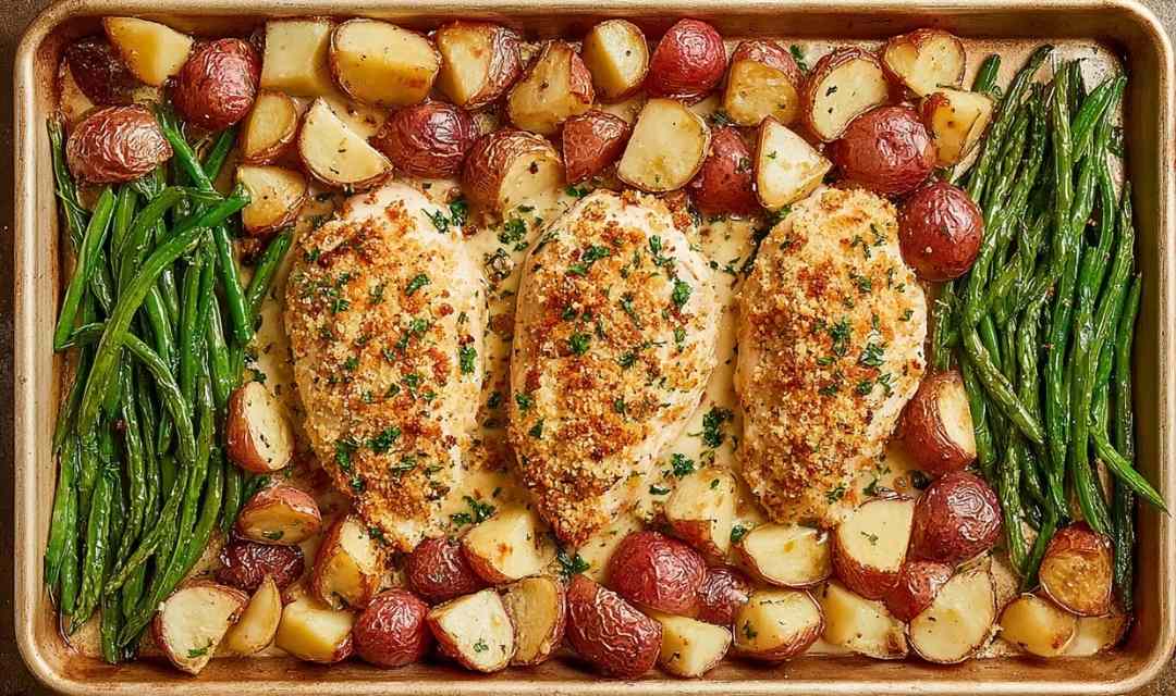 Complete one-pan meal with juicy parmesan crusted chicken, crispy roasted potatoes, and garlic green beans. Perfect for easy weeknight dinners.