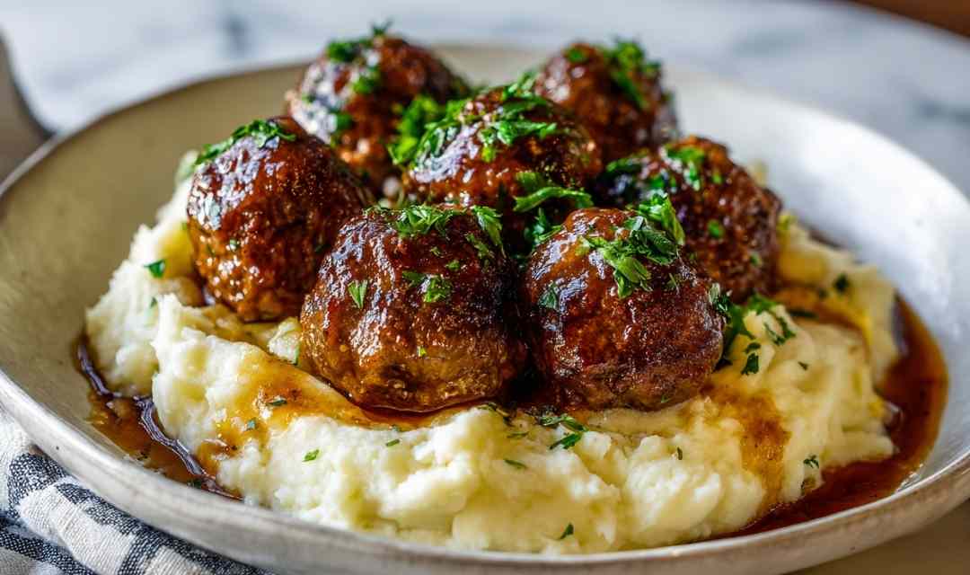 Juicy seasoned beef meatballs simmered in rich brown gravy, served with creamy garlic herb mashed potatoes. Perfect comfort food ready in 50 minutes.